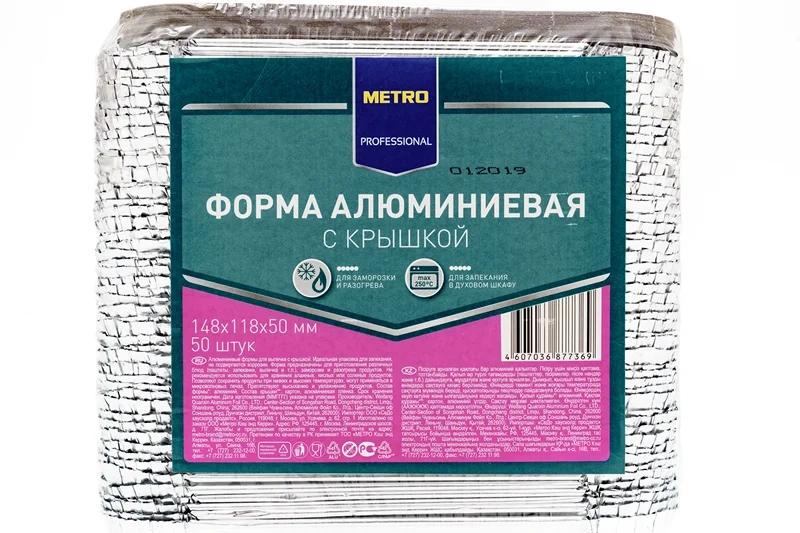 METRO PROFESSIONAL Формы алюминиевые с крышкой, 148х118х50 мм, 50 шт. — жаропрочная форма с удобными бортиками, которая хорошо подойдет для приготовления различных блюд. К материалу продукты не прилипают, и готовое кушанье легко извлекается. Изделие можно использовать в газовых и электрических духовых шкафах, морозильных камерах. Формы также подходят для хранения и заморозки продуктов, приготовления желе или холодца. Каждая формочка оснащается практичной крышкой. Накрывать крышку следует фольгированной стороной внутрь, что поможет продлить температурный режим продуктов, сохранит их свежесть. Крышка плотно прилегает к контейнеру, защищая его содержимое от проникновения влаги, пыли, посторонних частиц. Алюминий не вступает в реакции с продуктами и является безопасным материалом для здоровья человека.