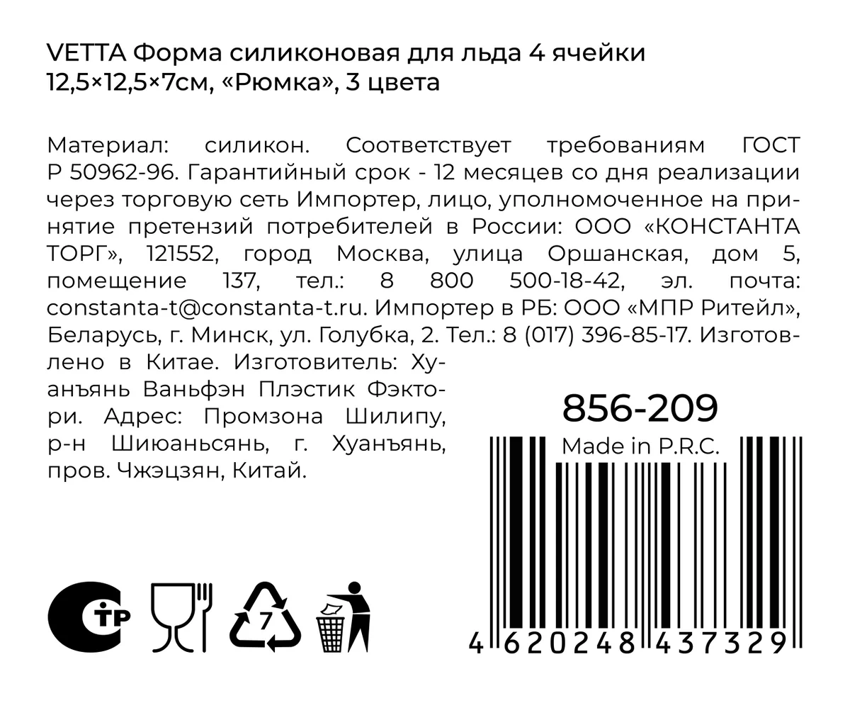 Форма для льда Vetta Рюмка силиконовая 4 ячейки, 12.5 x 12.5 x 7см