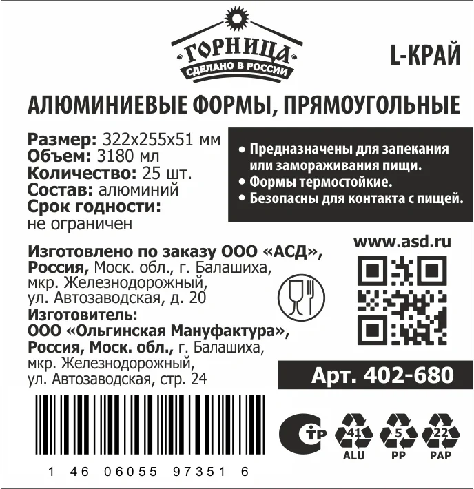 | Комплектация | форма алюминиевая прямоугольная - 25 шт. |