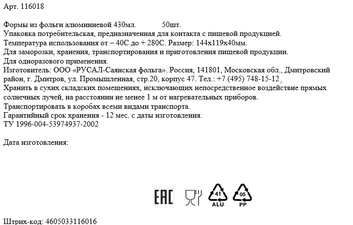 | Комплектация | форма алюминиевая с крышкой - 50 шт. |