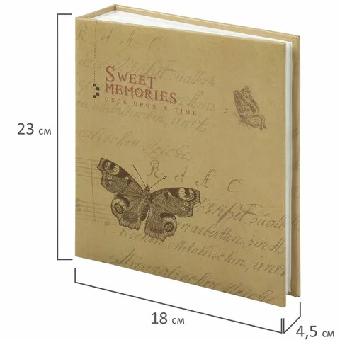 Состоит из 50 полипропиленовых листов размером 17,5х22 см с карманами и вмещает 200 фотографий размером 10х15 см по 2 штуки на странице. Обложка фотоальбома выполнена в романтическом светло-коричневом стиле. Размер - 18х23 см.