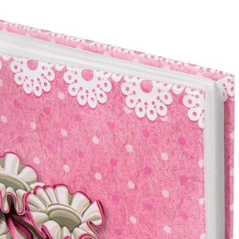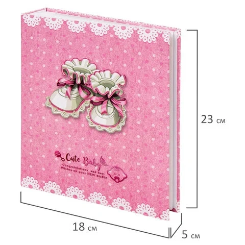 Состоит из 50 полипропиленовых листов размером 17,5х22 см с карманами и вмещает 200 фотографий размером 10х15 см по 2 штуки на странице. Обложка фотоальбома выполнена в розовых тонах, в детском дизайне с изображением пинеток, а его листы склеены в единый блок. Размер - 18х23 см.