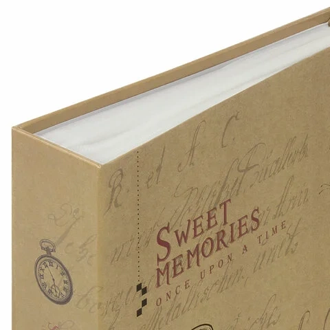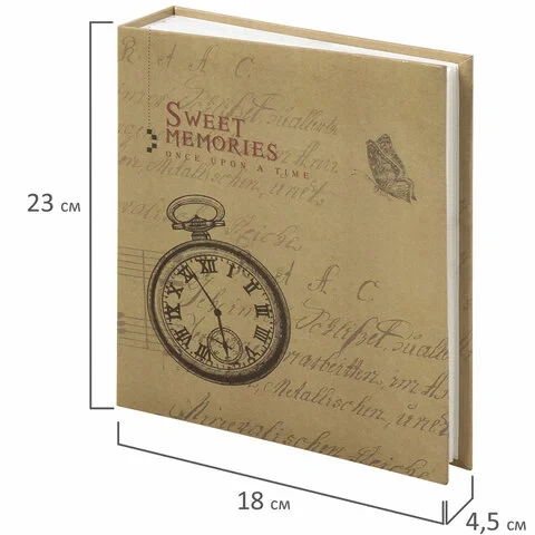 Состоит из 50 полипропиленовых листов размером 17,5х22 см с карманами и вмещает 200 фотографий размером 10х15 см по 2 штуки на странице. Обложка фотоальбома выполнена в романтическом светло-коричневом стиле. Размер - 18х23 см.