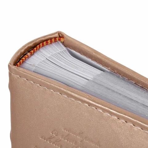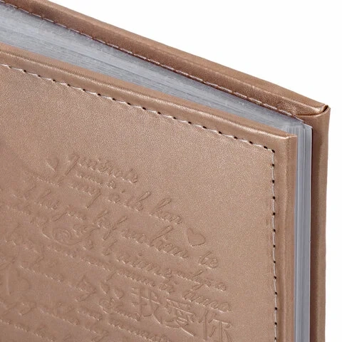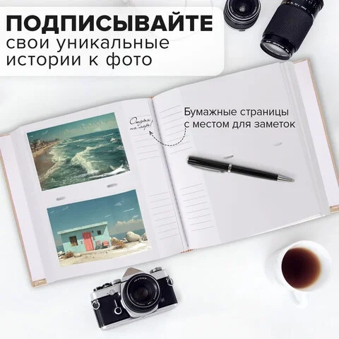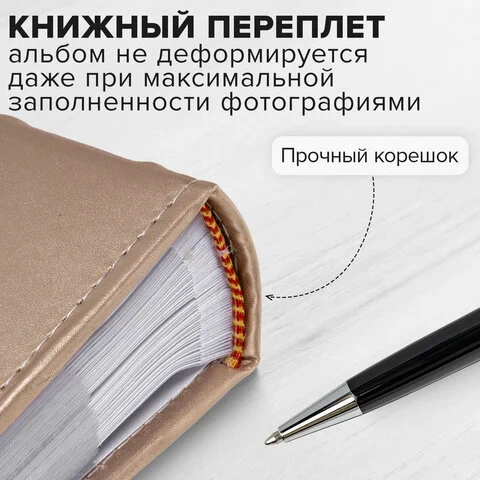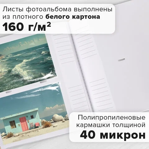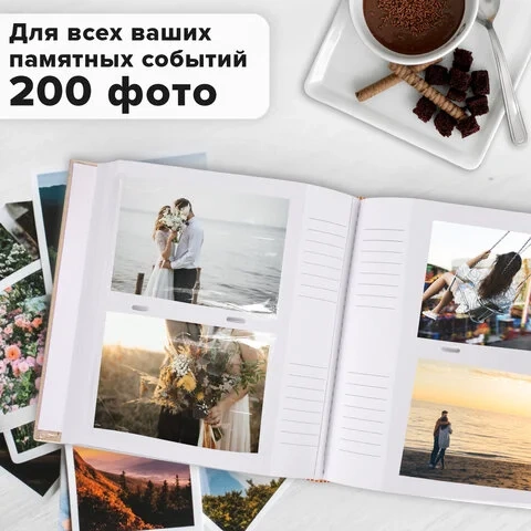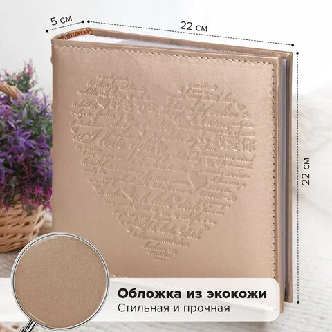 Состоит из 50 бумажных листов размером 15,5х21 см с карманами и вмещает 200 фотографий размером 10х15 см по 2 штуки на странице. Обложка фотоальбома выполнена из материала под кожу бежевого цвета. Фотоальбом с книжным переплетом отличается повышенной прочностью и долгим сроком службы. Размер - 22х22 см.