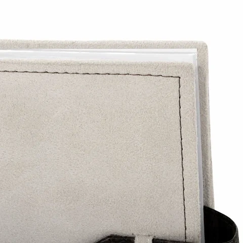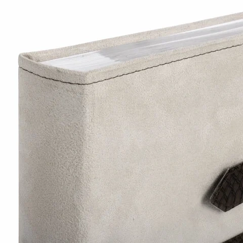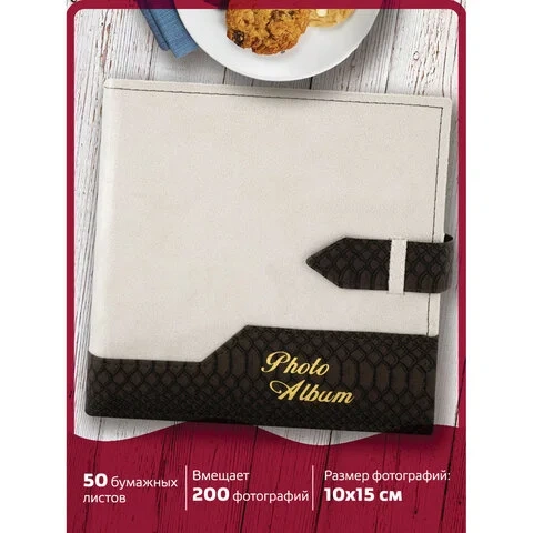 Состоит из 50 бумажных листов размером 15,5х21 см с карманами и вмещает 200 фотографий размером 10х15 см по 2 штуки на странице. Обложка фотоальбома скомбинирована из материалов под кожу рептилии и замшу контрастных коричневого и бежевого цветов, которая украшена регулируемой по длине застежкой. Фотоальбом с книжным переплетом отличается повышенной прочностью и долгим сроком службы. Размер - 20,7х21,8 см.