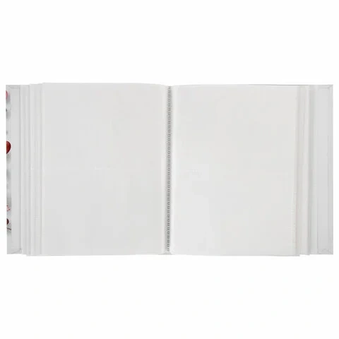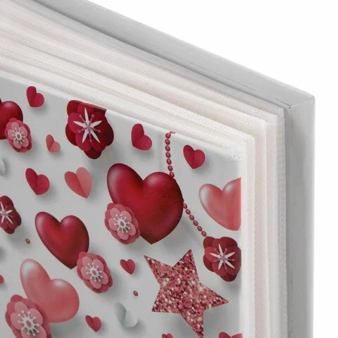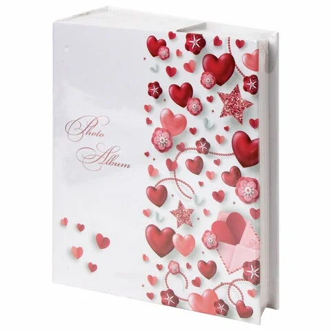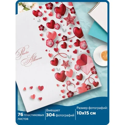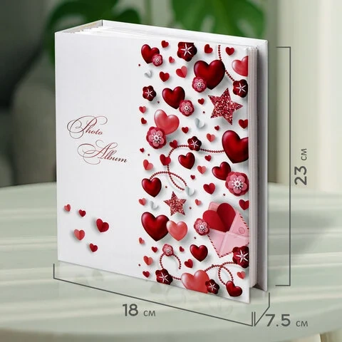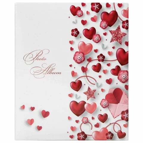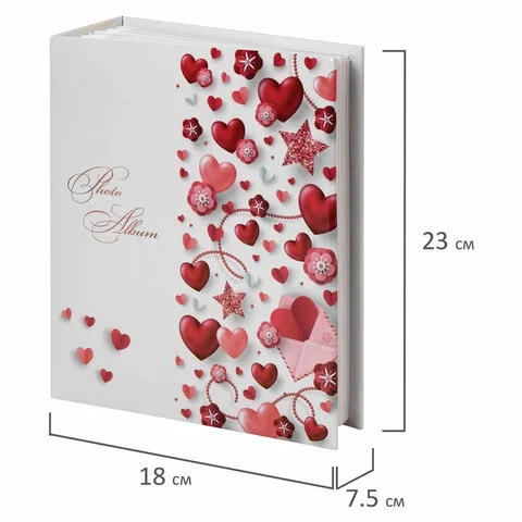 Состоит из 76 полипропиленовых листов размером 17,5х22 см с карманами и вмещает 304 фотографии размером 10х15 см по 2 штуки на странице. Обложка фотоальбома выполнена в белых и красных тонах с изображением сердец и звезд, а его листы склеены в единый блок. Размер - 18х23 см.