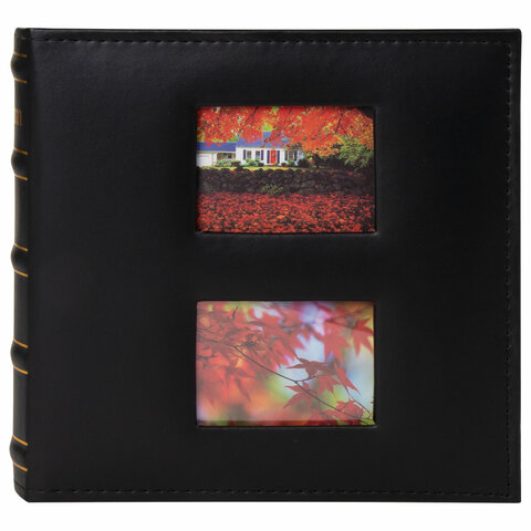 Состоит из 50 бумажных листов размером 15,5х21 см с карманами и вмещает 200 фотографий размером 10х15 см по 2 штуки на странице. Обложка фотоальбома выполнена из материала под кожу 'классик' черного цвета и декорирована двумя рамками, фотографии в которых могут быть заменены по желанию владельца. Фотоальбом с книжным переплетом отличается повышенной прочностью и долгим сроком службы. Размер - 22х22 см.