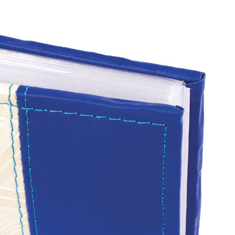 Состоит из 50 бумажных листов размером 15,5х21 см с карманами и вмещает 200 фотографий размером 10х15 см, по 2 штуки на странице. Обложка фотоальбома скомбинирована из материала под кожу классик синего цвета и белой вставки с рельефным рисунком. Фотоальбом с книжным переплетом отличается повышенной прочностью и долгим сроком службы. Размер - 20,7х21,8 см.