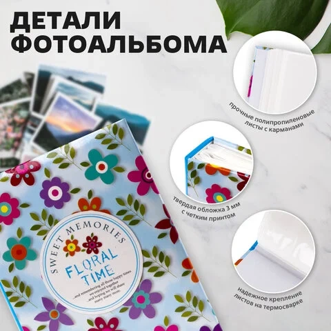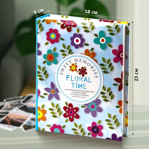 Состоит из 50 полипропиленовых листов размером 17,5х22 см с карманами и вмещает 200 фотографий размером 10х15 см по 2 штуки на странице. На обложке фотоальбома изображен цветочный принт, а его листы склеены в единый блок. Размер - 18х23 см.
