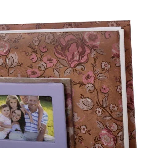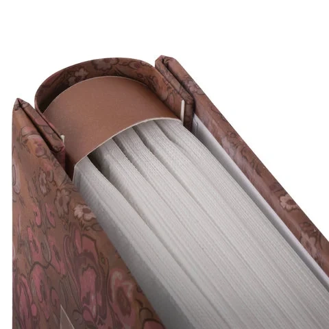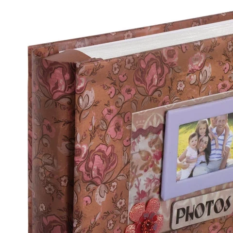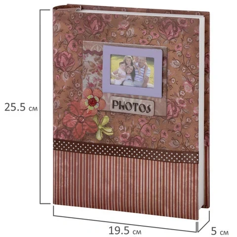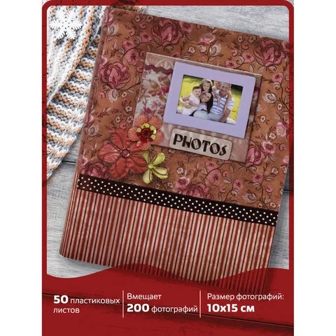 Состоит из 50 полипропиленовых листов размером 15,5х24,5 см с карманами и вмещает 200 фотографий размером 10х15 см по 2 штуки на странице. Обложка фотоальбома выполнена в красно-коричневом цвете и декорирована блестящими элементами, цветком, лентой и рамкой. Фотоальбом с книжным переплетом отличается повышенной прочностью и долгим сроком службы. Имеются поля для подписей. Размер - 19,5х 25,5 см.
