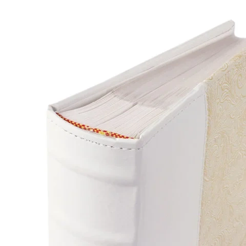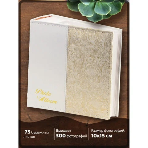 Состоит из 75 бумажных листов размером 15,5х21 см с карманами и вмещает 300 фотографий размером 10х15 см, по 2 штуки на странице. Обложка фотоальбома скомбинирована из материалов под гладкую и фактурную кожу белого и золотистого цвета. Фотоальбом с книжным переплетом отличается повышенной прочностью и долгим сроком службы. Имеются поля для подписей. Размер - 20,7х21,8 см.