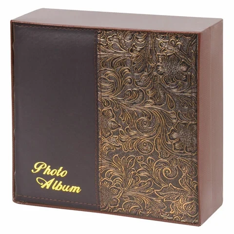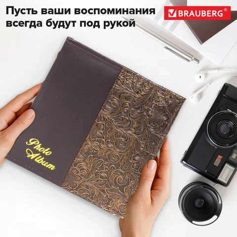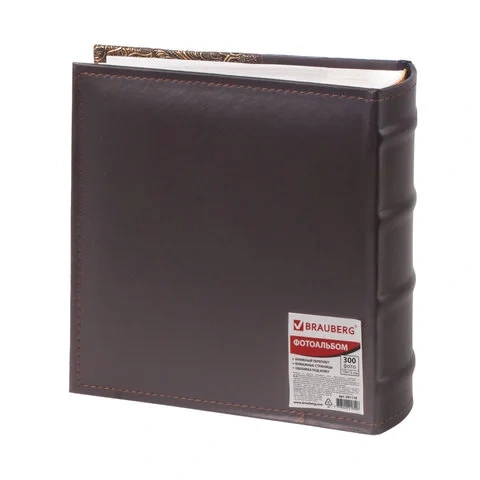 Фотоальбом BRAUBERG на 300 фото 10х15 см, под кожу, бумажные страницы, бокс, коричневый + золото, 39