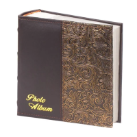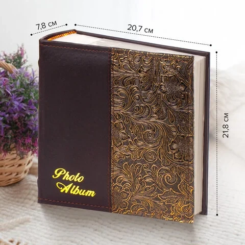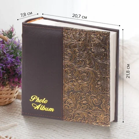 Состоит из 75 бумажных листов размером 15,5х21 см с карманами и вмещает 300 фотографий размером 10х15 см, по 2 штуки на странице. Обложка фотоальбома скомбинирована из материалов под гладкую и фактурную кожу коричневого и золотистого цвета. Фотоальбом с книжным переплетом отличается повышенной прочностью и долгим сроком службы. Размер - 20,7х21,8 см.