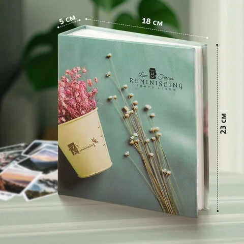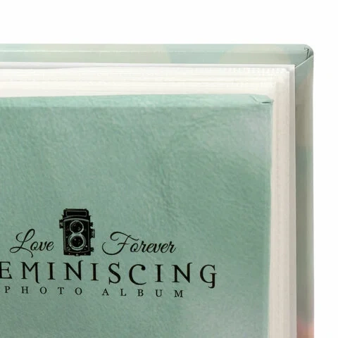 Состоит из 50 полипропиленовых листов размером 17,5х22 см с карманами и вмещает 200 фотографий размером 10х15 см по 2 штуки на странице. Обложка фотоальбома выполнена в необычном бирюзовом стиле. Размер - 18х23 см.