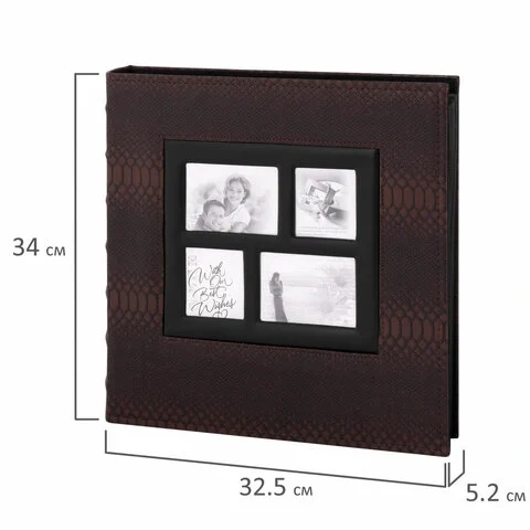 Состоит из 50 полипропиленовых листов размером 31,5х32,5 см с карманами и вмещает 500 фотографий размером 10х15 см по 5 штук на странице. Обложка альбома стилизована под кожу рептилии и декорирована 4-мя рамками, фотографии в которых могут быть заменены по желанию владельца. Фотоальбом с книжным переплетом отличается повышенной прочностью и долгим сроком службы. Размер - 32,5х34 см.