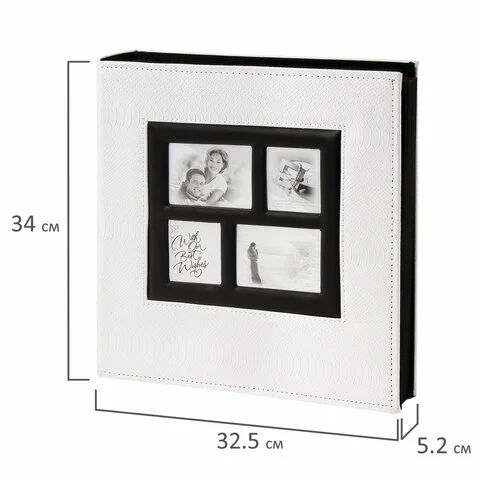 Состоит из 50 полипропиленовых листов размером 31,5х32,5 см с карманами и вмещает 500 фотографий размером 10х15 см по 5 штук на странице. Обложка альбома стилизована под кожу рептилии и декорирована 4-мя рамками, фотографии в которых могут быть заменены по желанию владельца. Фотоальбом с книжным переплетом отличается повышенной прочностью и долгим сроком службы. Размер - 32,5х34 см.