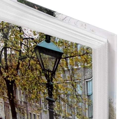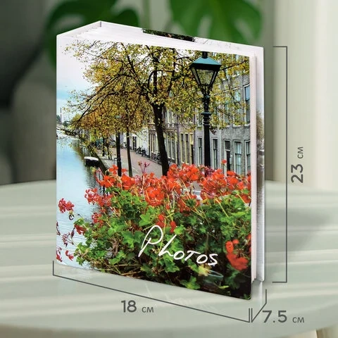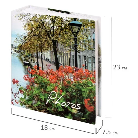 Состоит из 76 полипропиленовых листов размером 17,5х22 см с карманами и вмещает 304 фотографии размером 10х15 см по 2 штуки на странице. Обложка фотоальбома выполнена в голубых, красных и зеленых тонах с изображением городского пейзажа, а его листы склеены в единый блок. Размер альбома - 18х23 см.