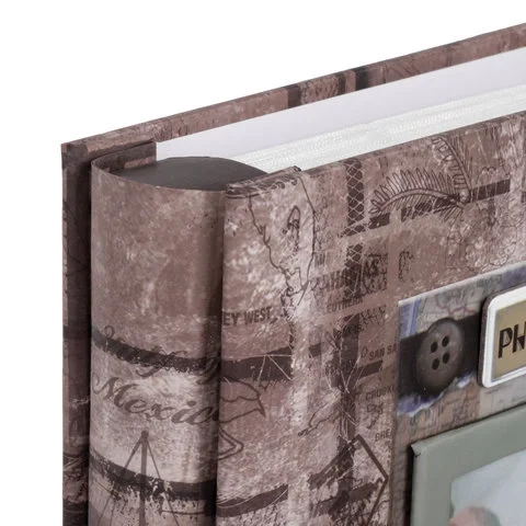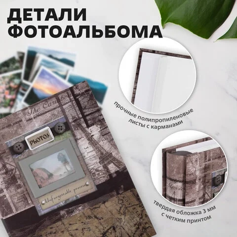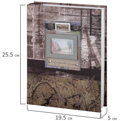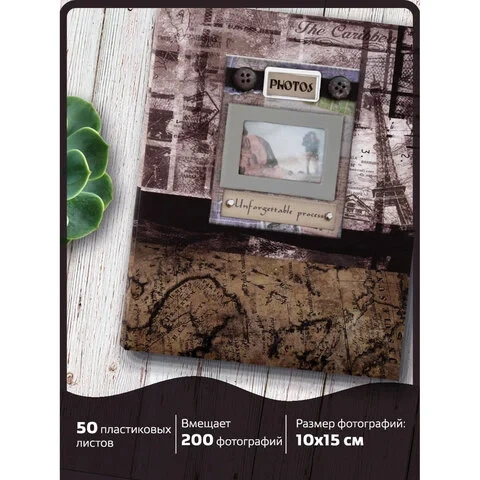 Состоит из 50 полипропиленовых листов размером 15,5х24,5 см с карманами и вмещает 200 фотографий размером 10х15 см по 2 штуки на странице. Обложка фотоальбома выполнена в коричнево-бежевых тонах и понравится любителям истории и приключений. Фотоальбом с книжным переплетом отличается повышенной прочностью и долгим сроком службы. Размер - 19,5х25,5 см.