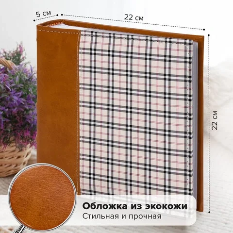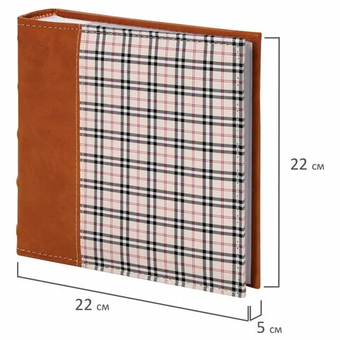 Состоит из 50 бумажных листов размером 15,5х21 см с карманами и вмещает 200 фотографий размером 10х15 см по 2 штуки на странице. Обложка фотоальбома скомбинирована из материала под кожу классик и вставки с клетчатым орнаментом. Фотоальбом с книжным переплетом отличается повышенной прочностью и долгим сроком службы. Размер - 22х22 см.