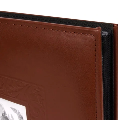 Состоит из 50 полипропиленовых листов с карманами и вмещает 500 фотографий размером 10х15 см по 5 штук на странице. Обложка альбома стилизована под гладкую кожу и декорирована рамкой для фотографии которую можно заменить по желанию владельца. Фотоальбом с книжным переплетом отличается повышенной прочностью и долгим сроком службы. Размер - 34х33 см.