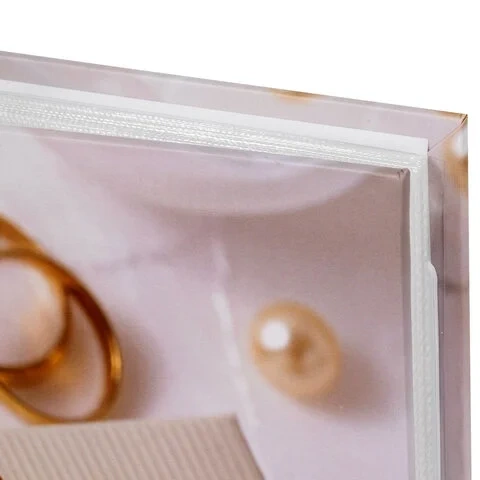 Состоит из 50 полипропиленовых листов размером 15,5х24,5 см с карманами и вмещает 200 фотографий размером 10х15 см по 2 штуки на странице. Обложка фотоальбома выполнена в белых и бежевых тонах с изображением обручальных колец и подарочной коробочки. Фотоальбом с книжным переплетом отличается повышенной прочностью и долгим сроком службы. Имеются поля для подписей. Размер - 19,5х25,5 см.