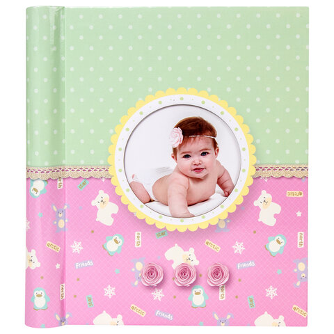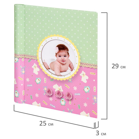 Состоит из 20 магнитных листов размером 23х28 см, что позволяет комбинировать и размещать до 120 фотографий различных форматов: 18х24 см, 10х15 см, 13х18 см. Обложка фотоальбома выполнена в детском дизайне в салатовом и розовом тонах и декорирована фоторамкой, фотография в которой может быть заменена по желанию владельца. Способ крепления страниц - спираль. Размер альбома - 25х29 см.