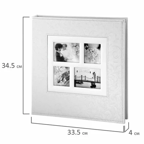 Состоит из 20 магнитных листов размером 30х32 см, что позволяет комбинировать и размещать до 200 фотографий различных форматов: 18х24 см, 20х30 см, 10х15 см, 13х18 см. Обложка альбома белого цвета стилизована под фактурную кожу и декорирована 4-мя рамками, фотографии в которых могут быть заменены по желанию владельца. Фотоальбом на кольцах отличается повышенной прочностью и долгим сроком службы. Размер - 33,5х34,5 см.