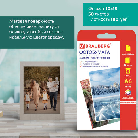 Фотобумага для струйной печати, 10х15 см, 180 г/м2, 50 листов, односторонняя матовая, BRAUBERG, 3631