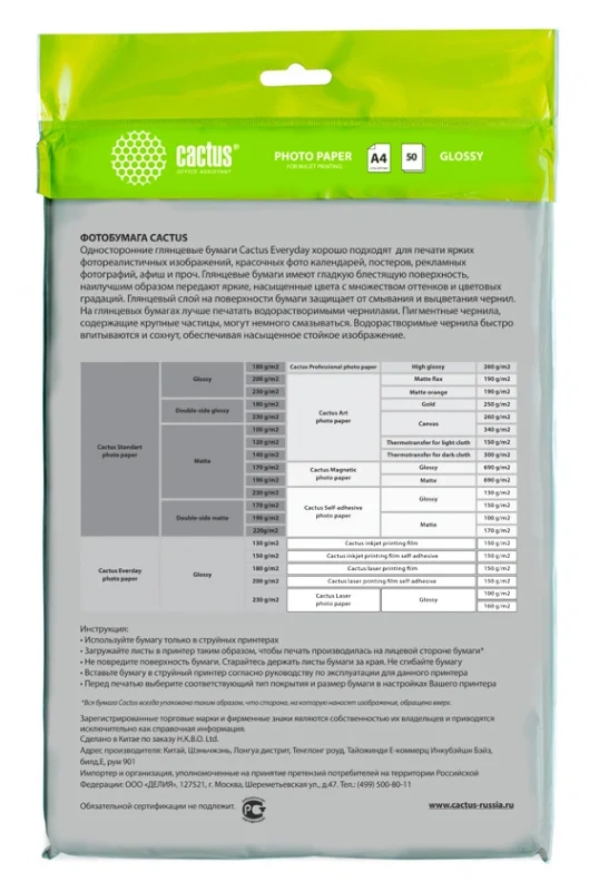 Фотобумага для струйных принтеров Cactus CS-GA413050ED А4, 50 листов, 130 г/м2, белая, глянцевая