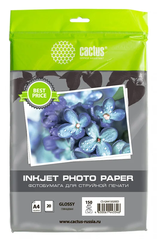Фотобумага для струйных принтеров Cactus CS-GA415020ED А4, 20 листов, 150 г/м2, белая, глянцевая