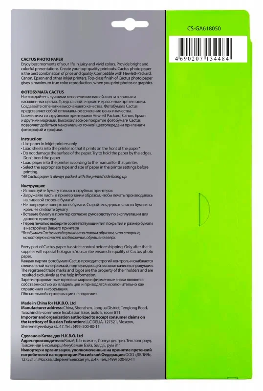 Фотобумага для струйных принтеров Cactus CS-GA618050 10x15см, 50 листов, 180 г/м2, белая, глянцевая
