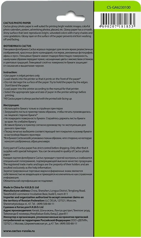 Фотобумага для струйных принтеров Cactus CS-GA6230100 10x15см, 100 листов, 230 г/м2, белая, глянцевая