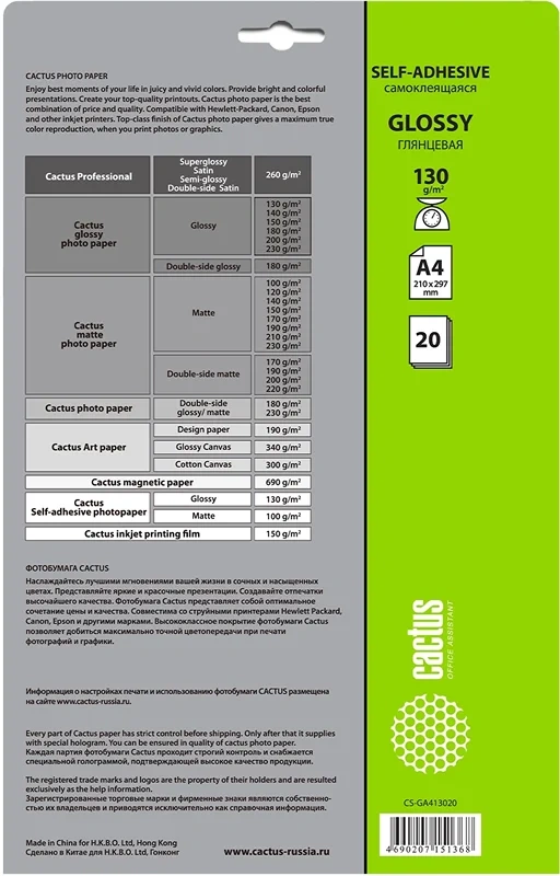 Фотобумага для струйных принтеров Cactus CS-GSA413020 А4, 20 листов, 130 г/м2, белая, глянцевая