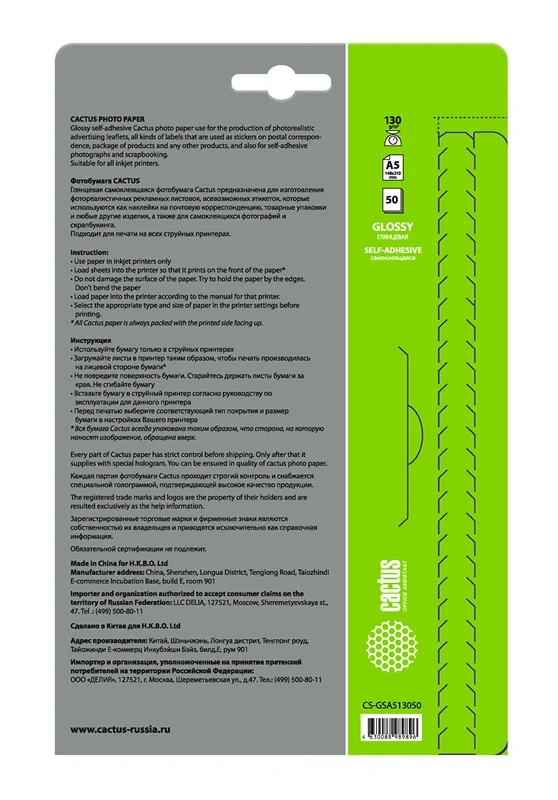 Фотобумага для струйных принтеров Cactus CS-GSA513050 A5, 50 листов, 130г/м2, глянцевая самоклеящаяся