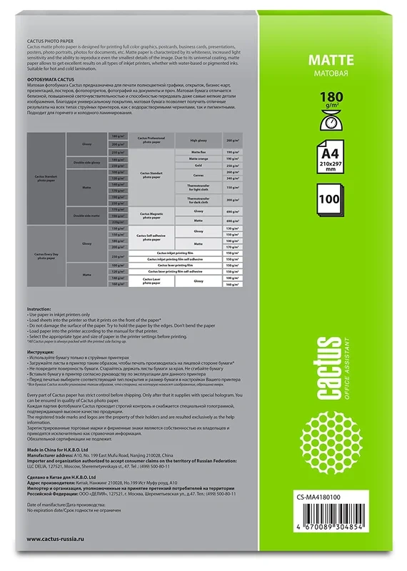 Фотобумага для струйных принтеров Cactus CS-MA4180100 A4, 100 листов, 180г/м2, белая, матовая