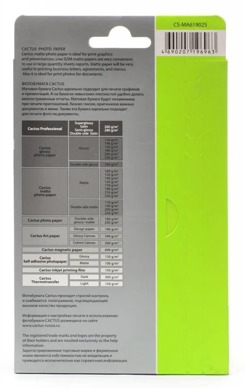 Фотобумага для струйных принтеров Cactus CS-MA619025 10x15см, 25 листов, 190 г/м2, белая, матовая