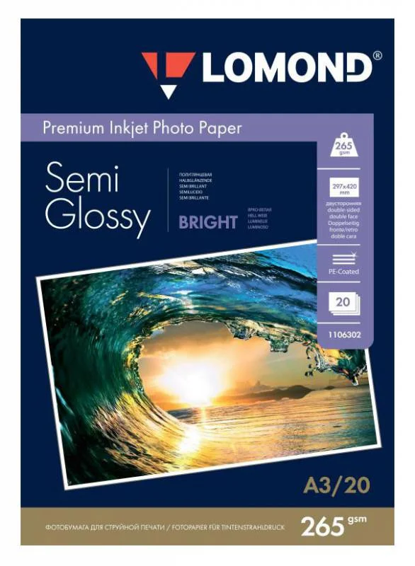 Фотобумага для струйных принтеров Lomond 1106302 А3, 20 листов, 265 г/м2, белая, полуглянцевая