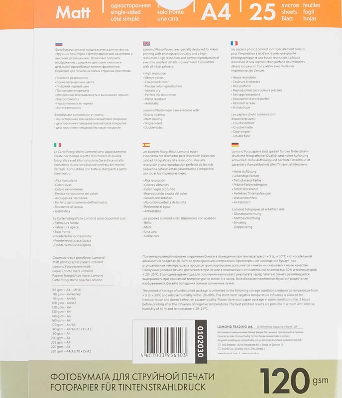 Фотобумага для струйных принтеров Lomond A4, 25 листов, 120г/м2, белая, матовая, 0102030
