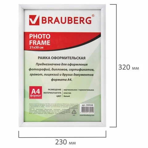 Рамка Brauberg Hit2 белая, 21х30см, пластик