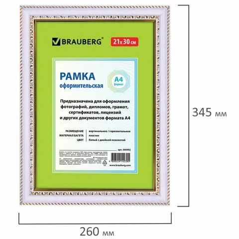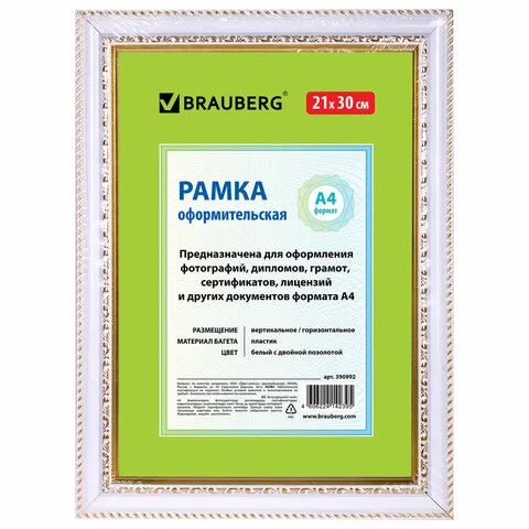 Рамка Brauberg Hit4 белая с двойной позолотой, 21х30см, пластик