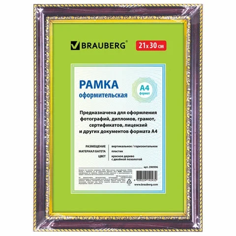 Рамка Brauberg Hit4 красное дерево с двойной позолотой, 21х30см, пластик