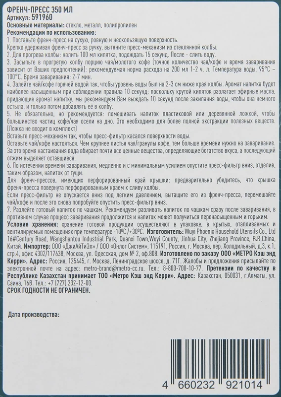METRO PROFESSIONAL Френч-пресс Линии, 350 мл — это простой и быстрый способ заваривания кофе/чая, позволяющий сохранить максимум вкуса и аромата напитка. Изделие представляет собой цилиндрический заварочный чайник из стекла со специальным металлическим поршнем, который прижимает кофейную гущу или чайную смесь ко дну, благодаря чему частицы не попадают в чашку вместе с жидкостью. Основным преимуществом френч-пресса является простота его использования. Чтобы насладиться чашечкой ароматного напитка, достаточно засыпать внутрь стеклянной емкости чайную смесь или кофе, залить горячей водой, дать настояться и опустить пресс-фильтр. Кроме того, френч-пресс работает абсолютно автономно (ему не нужен газ или электричество). Не требует регулярной замены расходных материалов, таких как капсулы или фильтры. Легко моется обычной водой без использования химии, идеально подходит для заваривания как кофе, так и чая. Позволяет сэкономить время на заваривании. Так, например, кофе во френч-прессе приготовится значительно быстрее, нежели в обычной турке и даже кофеварке. Частички чайной смеси или кофейная гуща не попадают вместе с жидкостью в чашку. Френч-пресс — лучшее решение, позволяющее быстро и без проблем приготовить любимый напиток.