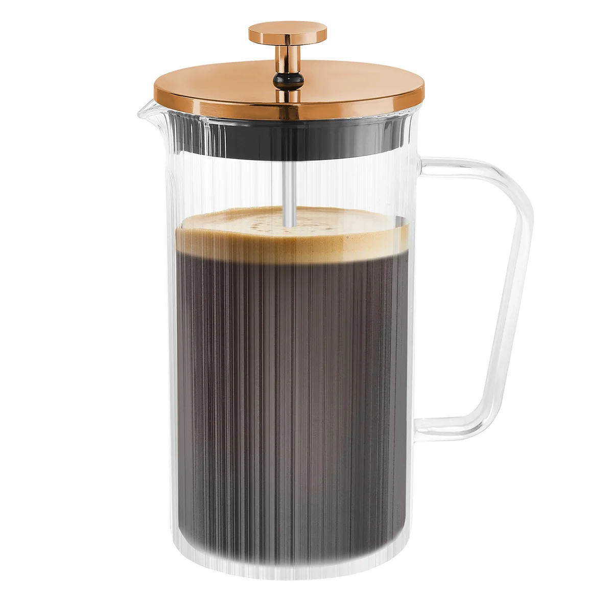 Френч-пресс, 1100мл, колба из жаропрочного стекла, устойчивого к перепадам температур крышка и поршень из высококачественной нержавеющей стали. Эргономичный поршень с фильтром из нержавеющей стали 18/10. Крышка из высококачественной нержавеюшей стали с фильтром из пищевого пластика. Удобная мерная ложка в комплекте. Гарантия 3 года.