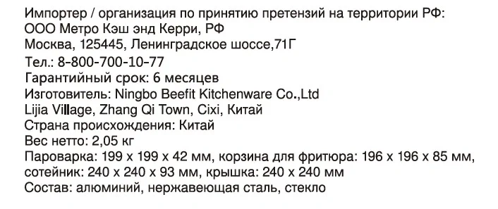 | Комплектация | фритюрница-пароварка - 1 шт.; решетка для фритюра - 1 шт.; сетка для готовки на пару - 1 шт.; крышка |