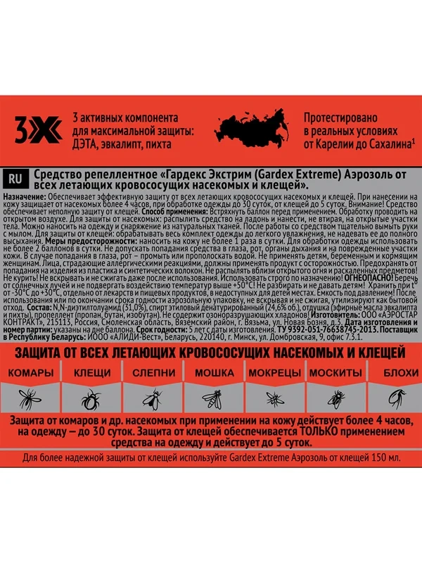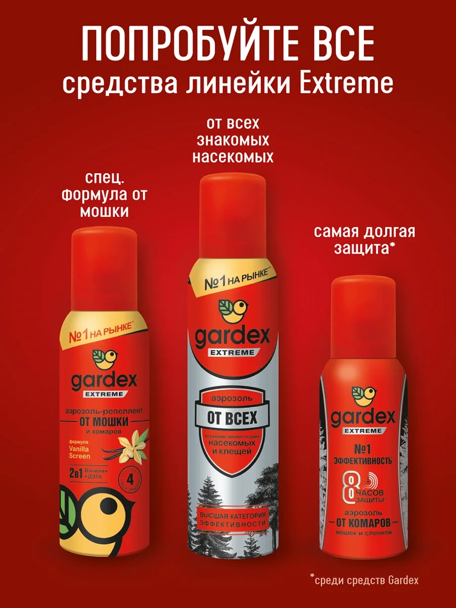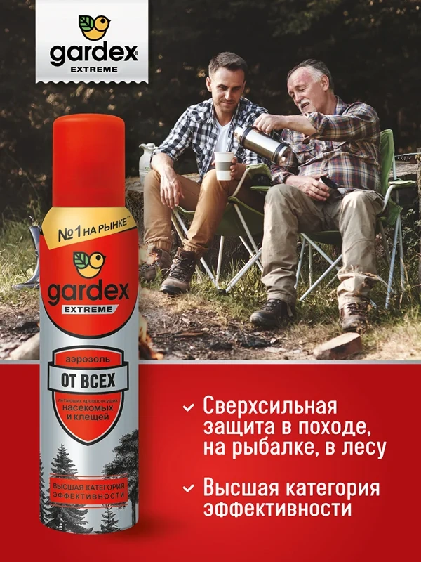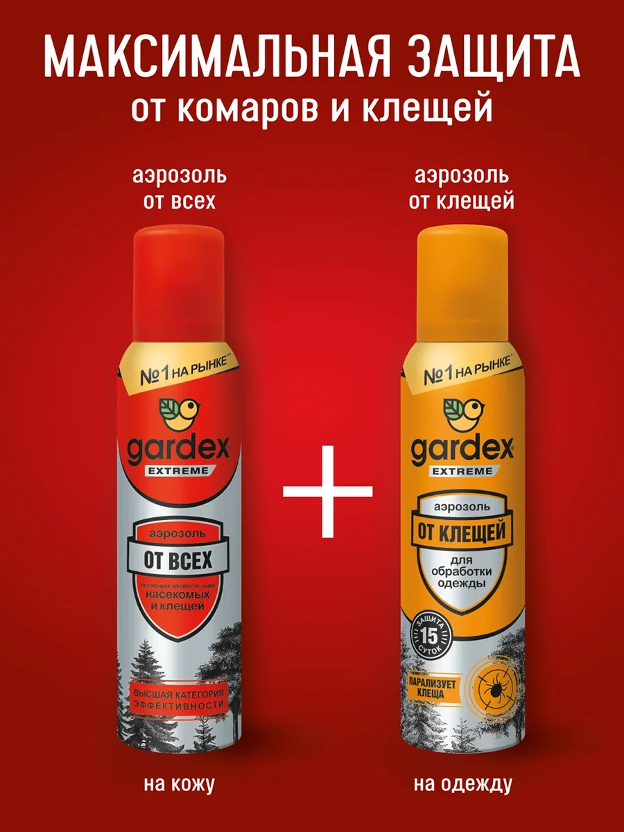 GARDEX Аэрозоль-репеллент от всех летающих, кровососущих насекомых и клещей Extreme 150мл – это эффективное средство, которое обеспечивает защиту от клещей, блох и других кровососущих насекомых. Отлично подходит для нанесения, как на открытые участки кожи, так и на одежду, снаряжение, изготовленное из натуральных тканей. Спрей можно использовать в любое время года. Он имеет легкую текстуру. Является безвредным для людей и домашних животных. Эффект от использования средства на вещи длится до 30 суток. Способ применения довольно прост. Для этого следует встряхнуть баллон в течение нескольких секунд, распылить содержимое на руку и нанести на тело не более одного раза в сутки. Нельзя допускать попадания средства в нос, рот, глаза и на поврежденные участки кожи. Выпускается в небольшом баллоне с оригинальным дизайном, который с легкостью поместится в рюкзак или сумку.Gardex – это известная торговая марка, которая выпускает различные эффективные и безопасные средства защиты от насекомых. Она начала свою работу более 12 лет назад. Сегодня бренд также не перестает развиваться и выпускает новую инновационную продукцию, совершенствует составы. Широкий ассортимент продукции включает в себя: аэрозоли для взрослых и детей.