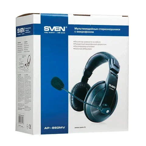 Наушники оснащены регулируемым оголовьем, регулятором громкости, поворотным микрофонным держателем и штекером 3,5 мм (3 pin) для подключения ПК. Регулируемое оголовье устройства обеспечивает удобную посадку гарнитуры на голове. Поворотный держатель позволяет установить микрофон на оптимальном для пользователя расстоянии. Управление громкостью в модели SVEN AP-860MV осуществляется с помощью регулятора громкости.