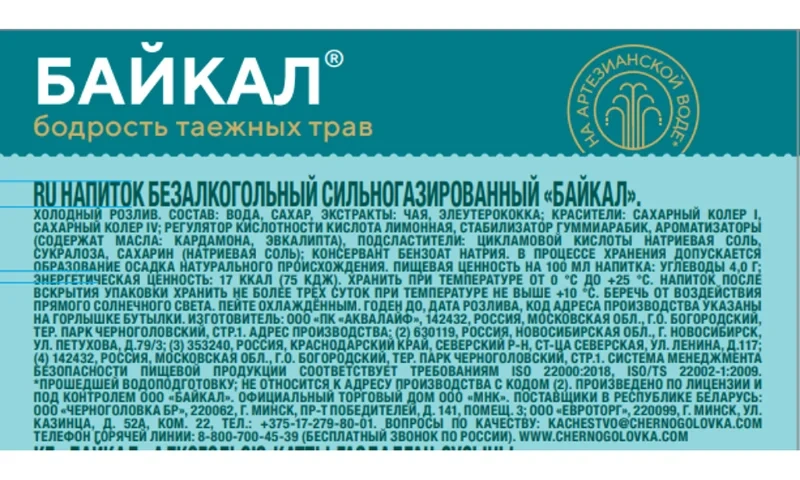 Напиток газированный Байкал НАПИТКИ ИЗ ЧЕРНОГОЛОВКИ, 2 л – легендарный продукт, созданный в 1977 году в качестве альтернативы Coca-Cola. Благодаря насыщенному и освежающему вкусу он быстро завоевал популярность и стал официальным напитком Олимпиады 1980 года. Байкал изготовлен на основе чистейшей воды из артезианской скважины, а также экстрактов пряных трав и черного чая. Он хорошо утоляет жажду, помогает восстановить силы и дарит бодрость. Напиток обладает красивым красновато-коричневым цветом и богатым многогранным ароматом. Он помещен во вместительную бутылку из пищевого пластика объемом 2 литра и герметично закрыт винтовым колпачком. Напиток хорошо подойдет как для употребления во время обеда или ужина, так и для сервировки праздничных столов, в том числе во время приема большого количества гостей.Тип продукта: напиток сильногазированный. Натуральные ингредиенты.Состав: вода артезианская подготовленная, сахар, экстракты: элеутерококка, черного чая, краситель сахарный колер Е150d, натуральные ароматические вещества, кислота лимонная, масла: кардамона, лимона, консервант бензонат натрия.Пищевая ценность: углеводы 10 г.Энергетическая ценность: 40 ккал.Упаковка: пластиковая бутылка.Объем: 2 л.Условия хранения: хранить при температуре от 0°C до +25°С. Напиток после вскрытия упаковки хранить не более 3 суток при температуре не выше +10°C. Беречь от воздействия прямого солнечного света.Срок годности: 12 месяцев.Бренд: Черноголовка.Страна-производитель: Россия.ГОСТ Р 54762-2011 , ГОСТ 28188-2014 , ISO 22000:2005
