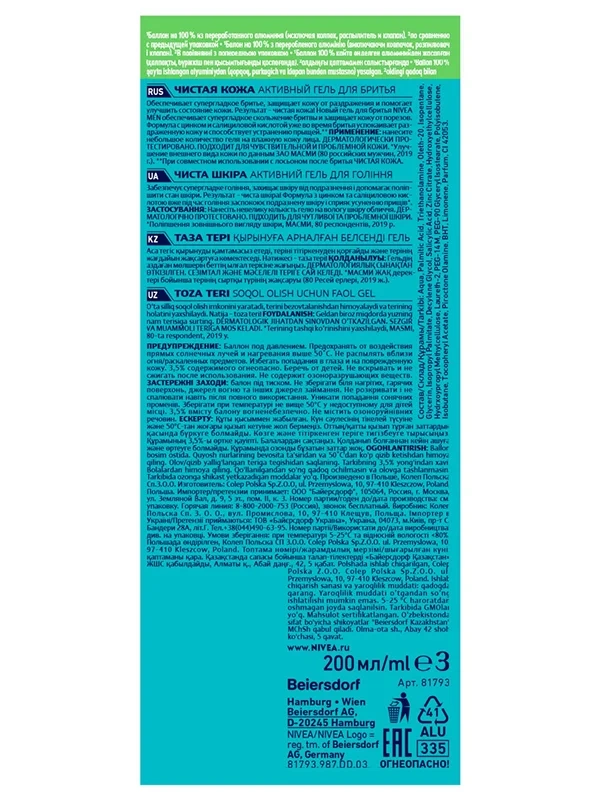 Беспокоят прыщи и другие кожные высыпания, и бритье становится пыткой? Тогда линейка средств для и после бритья Nivea Men Чистая Кожа для проблемной кожи с цинком и салициловой кислотой именно то, что тебе нужно. Гель для бритья Nivea Men Чистая кожа с суперингредиентами в составе сделают кожу чистой, а гладким и бритье приятным. Салициловая кислота бережно отшелушивает отмершую кожу и уничтожает бактерии, вызывающие прыщи. Цинк препятствует росту микроорганизмов и уменьшает раздражение кожи. Улучшает внешний вид кожи за 7 дней при ежедневном использовании. Для наилучшего эффекта используйте лосьон после бритья Nivea Men Чистая Кожа. Применение: хорошо встряхните перед использованием, держите баллон вертикально при выдавливании. Нанесите небольшое количество средства на влажное лицо.