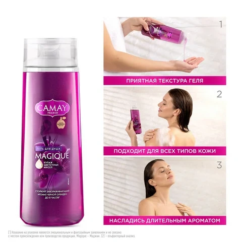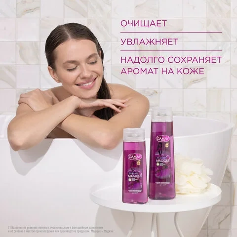 В основе парфюмированных средств для ухода за собой Camay лежат премиальные парфюмерные композиции. Они пробуждают чувственность и ощущение красоты, ухаживают за кожей, придавая ей нежность после каждого принятия душа или ванны.