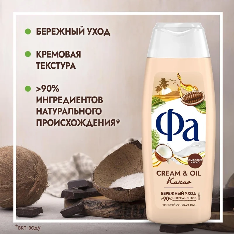 Увлажняйте и питайте свою кожу с помощью Фа парфюмированного крем-геля для душа серии Cream & Oil Какао, созданного специально для женщин, которые ценят нежный уход и утончённые ароматы. Этот продукт объединяет в себе мягкий очищающий гель и роскошный аромат какао, погружая вас в атмосферу уютного спа-салона прямо дома. Особенностью крема является его уникальная кремовая текстура, которая легко распределяется по коже, создавая нежное пенное облако. Гель интенсивно увлажняет и питает кожу, делая её мягкой и шелковистой. Более 90% ингредиентов имеют натуральное происхождение, что гарантирует безопасность и эффективность продукта. Преимущества: - Бережный уход: деликатная формула защищает кожу от пересушивания и раздражения. - Парфюмерная композиция: насыщенный аромат какао наполняет ванную комнату приятными нотами сладкого десерта. Этот гель для душа станет отличным дополнением вашего ежедневного ухода, помогая поддерживать кожу здоровой и ухоженной. Особенности: - Подходит для всех типов кожи. - Эффективное увлажнение и питание. - Небольшой флакон - удобно брать в спорт-зал или поездку. Насладитесь роскошью ухода с Фа Крем-гелем для душа Cream & Oil Какао и ощутите всю прелесть качественного очищения и питания кожи!